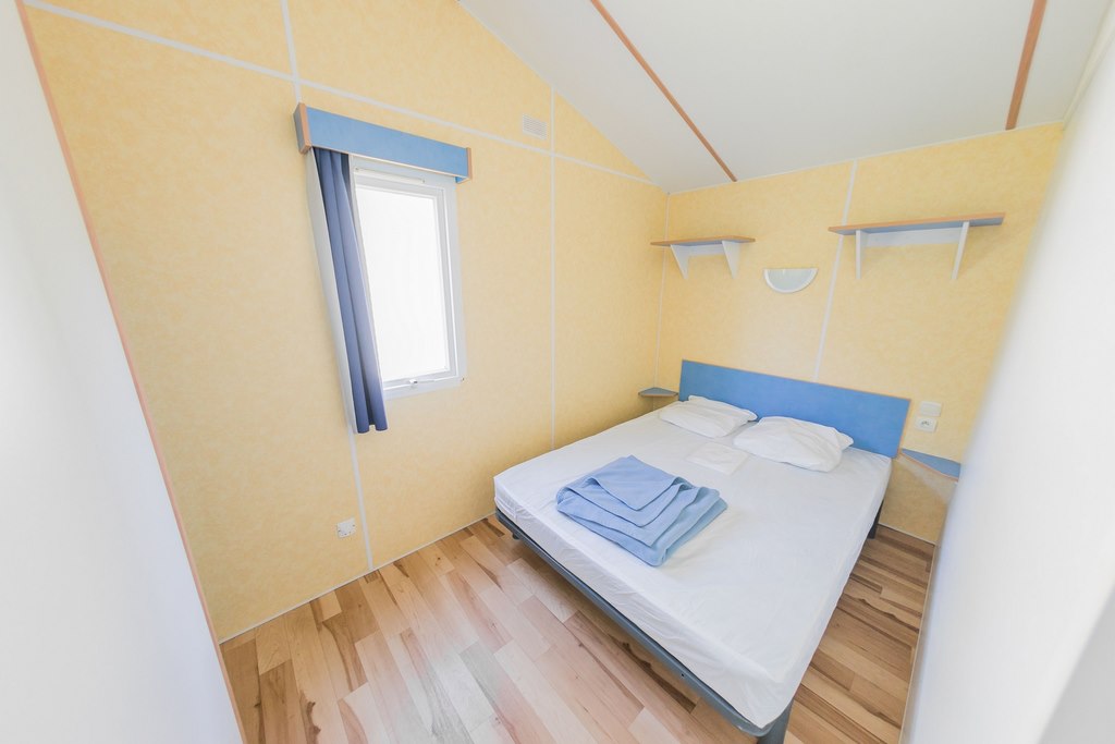 Mobil home de 24m² pour 4 personnes, comprenant 2 chambres, un séjour avec TV et coin cuisine, une salle de bain avec douche et WC séparé, et une terrasse couverte.